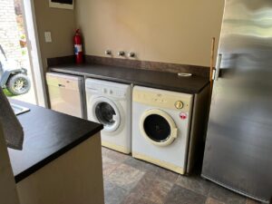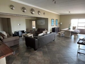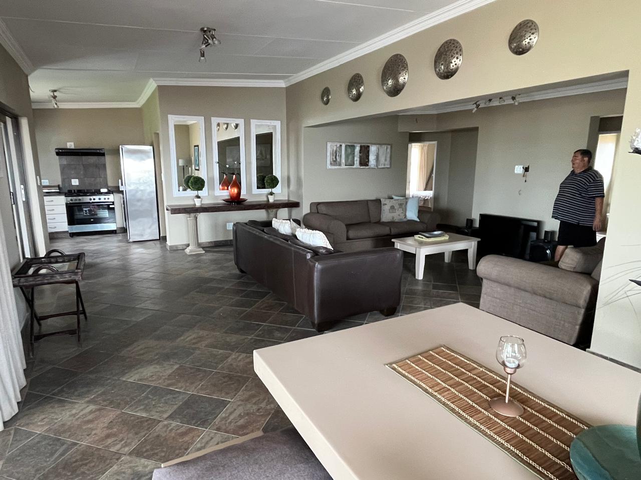 This 4-bedroom house with 2 ensuite bathrooms as well as a family bathroom is elevated to provide panoramic views over the dam and game reserve. Ground level storeroom with cupboards and storage as neat as a pin. Kitchen door will provide easy wheelchair access to one level house. Kitchen and scullery with high quality appliances, pantry and brand- new gas stove. This and all furniture and decorations included.