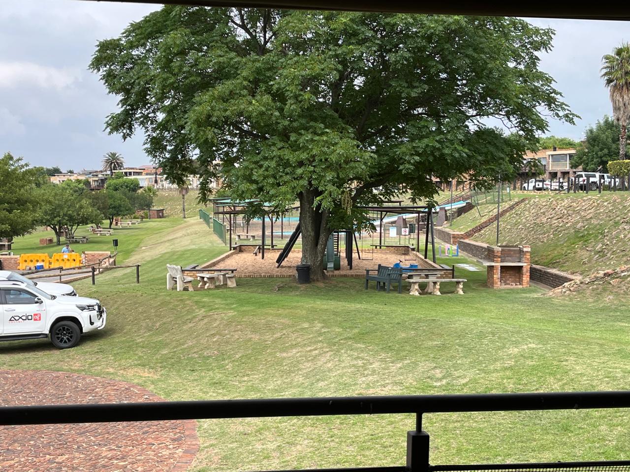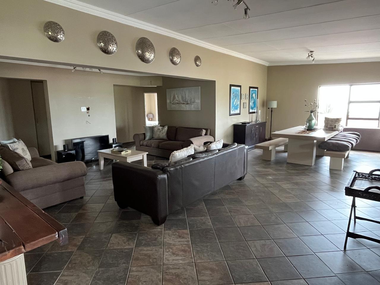 The open plan living area (and main bedroom) provides a view over dam, playground and swimming pool.